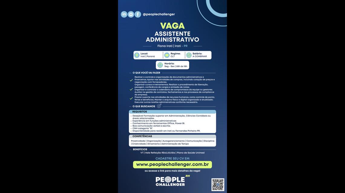 Estamos em busca de Assistente administrativo. O profissional será responsável por realizar as atividades administrativas dando suporte à gestão de áreas florestais.